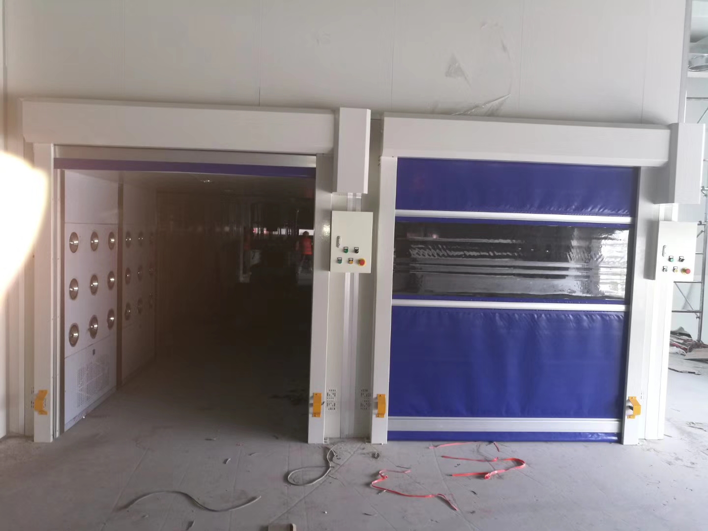 密封性能:门帘底部U型气囊布兜可与不平整地面严密贴合,门框双侧密封毛条防尘、防虫。